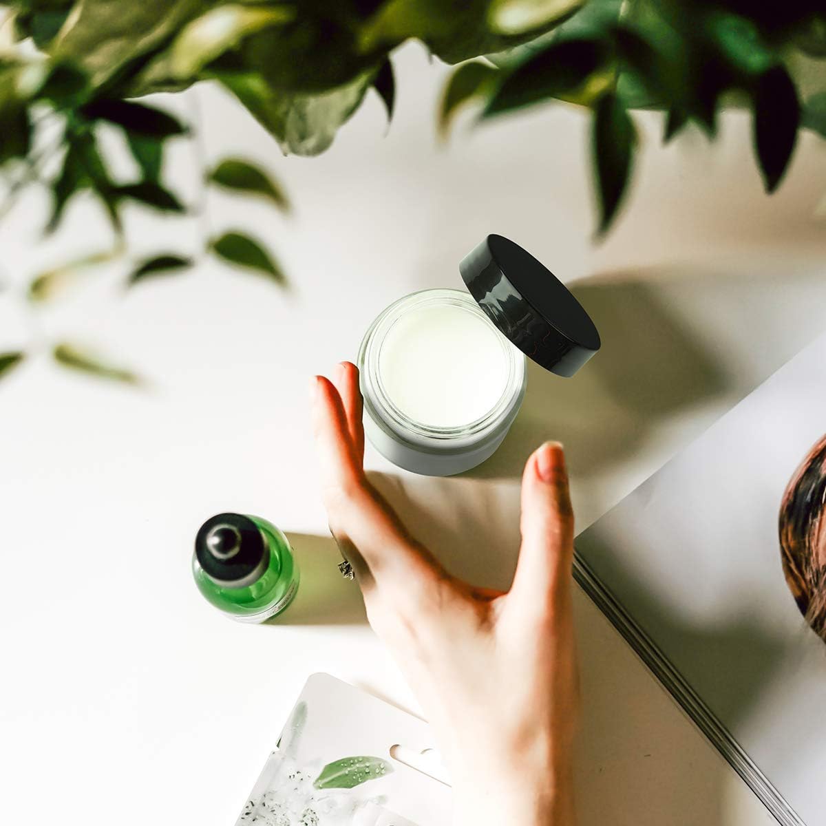 - Great Material: The 2 oz glass jars with lids made of great material clear glass, is no bad smell, does not influence your skincare products, stable, high temperature resistance, a black plastic cover with lid, no BPA, sealed storage, and does not leak