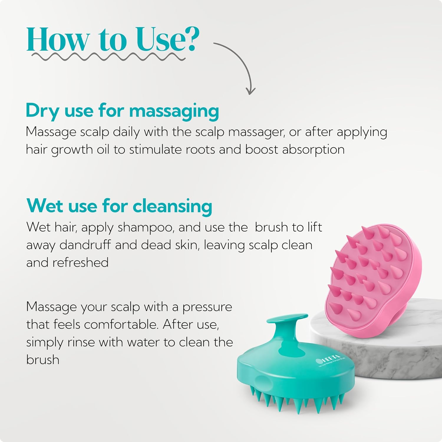 - Multiple Benefits: The scalp scrubber can be used in the shower, and apart from cleaning, it also massages the scalp, relieves itching, reduces stress and help hair growth, making it the hair washing tool