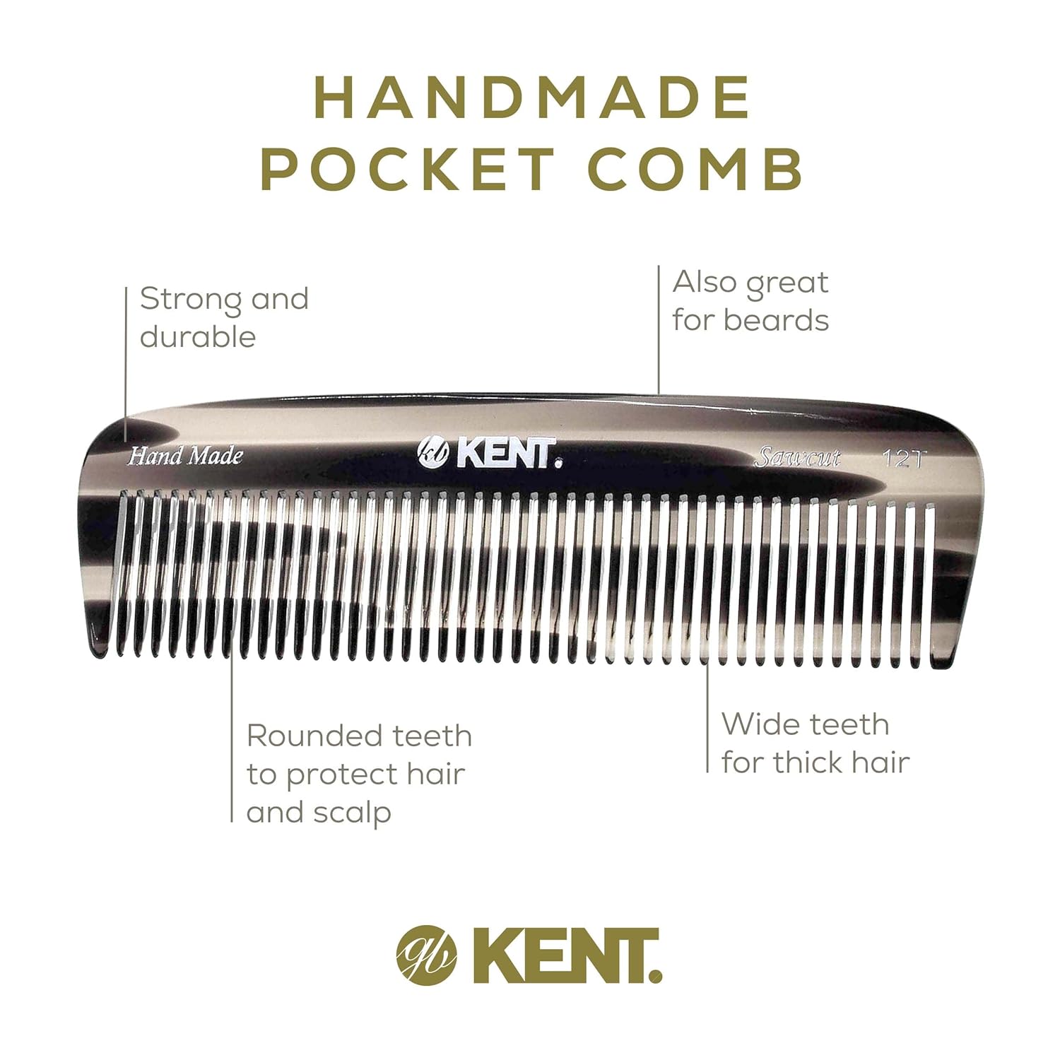 Kent 12T G Wide Tooth Detangling and Grooming Comb - Handmade Pocket Comb for Thick, Curly, Wavy Hair - Large Tooth Hair Detangler for Beard and Mustache - Saw-Cut and Hand Polished