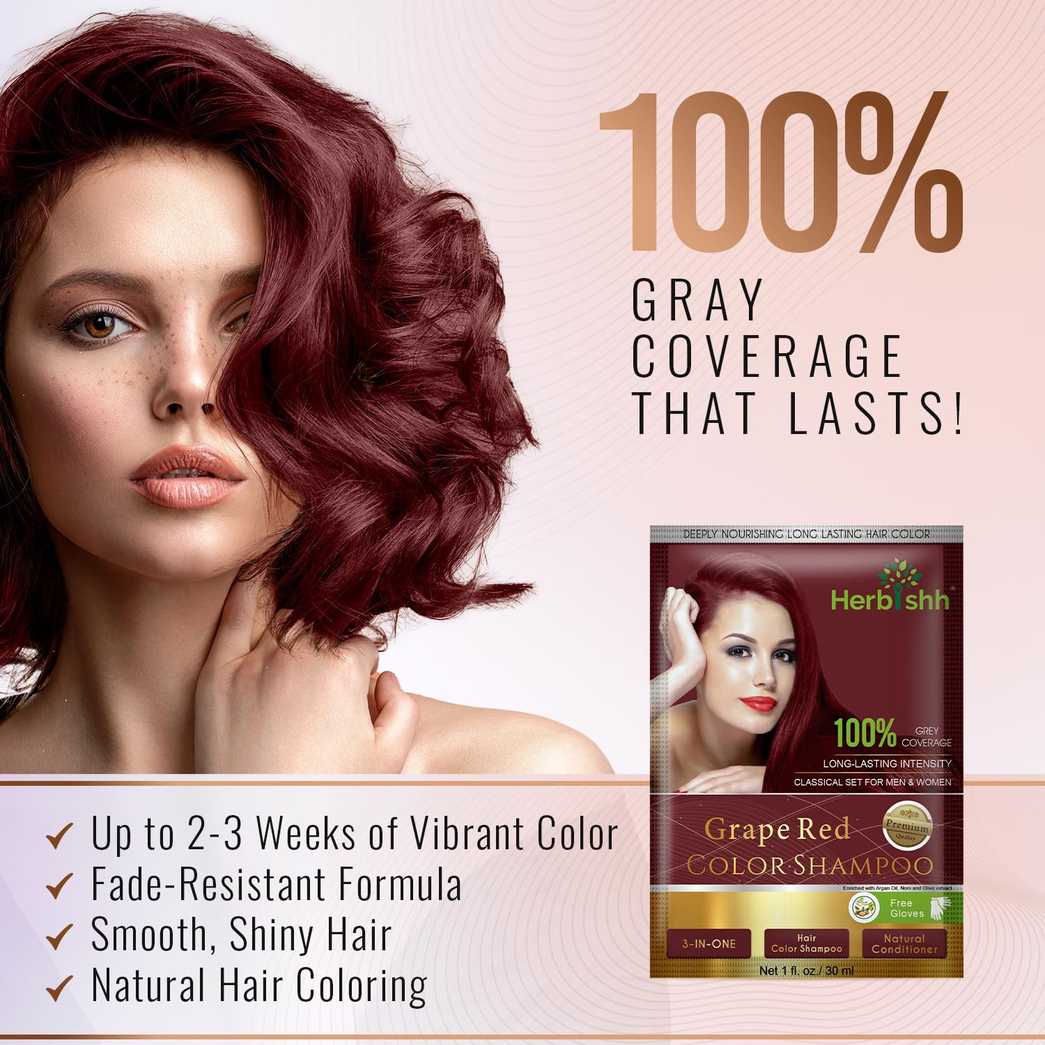 - LONG LASTING GREY COVERAGE – Give your greying hair a new lustrous, vibrant, and young look, while replenishing the lost health of weak strands with Herbishh Hair Color Shampoo for Grey Hair. With a special combination of active botanicals, our hair color shampoo dye is sure to give your hair a deep grape red color that will last up to 2 to 3 weeks.