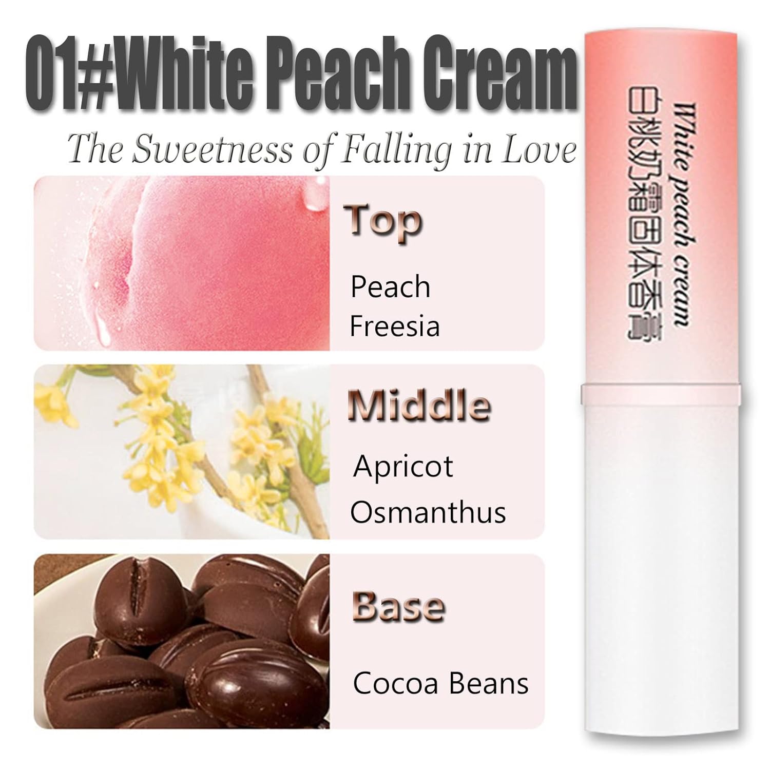 - 【 Solid Balm 01# White Peach】The flavor of the balm 01# White Peach Cream contains peach and freesia, apricot, osmanthus and baked cocoa beans. It's a sweet and light solid balm for girls.