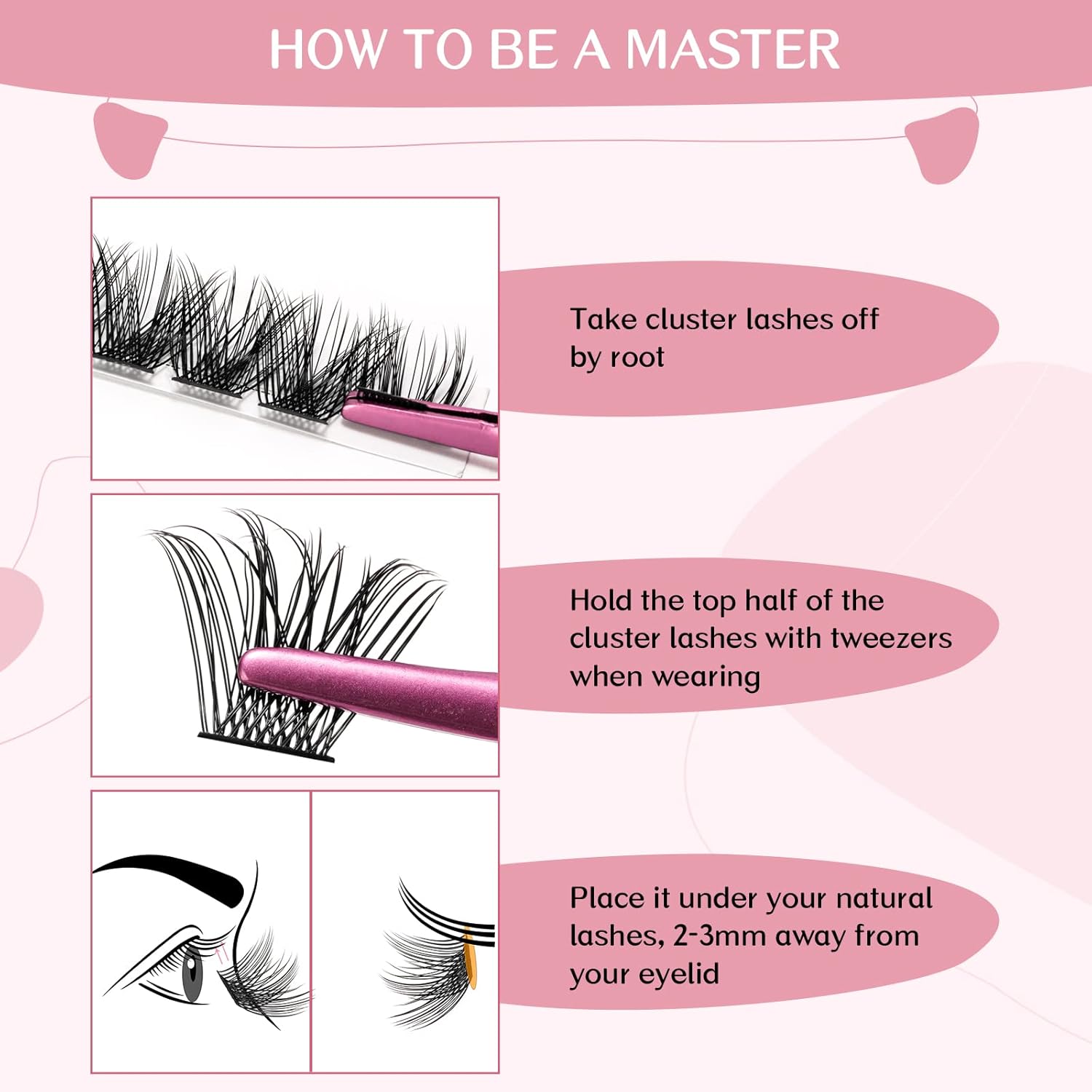 - How to Use: Apply the mascara wand cluster lash glue to your natural lashes and wait about 30 seconds.Gently take lashes off the strip by grab them at the root. Then apply the cluster lashes underneath your natural eyelashes, away 2-3mm from your eyelid! Finally, star your new day with your new eyelash!