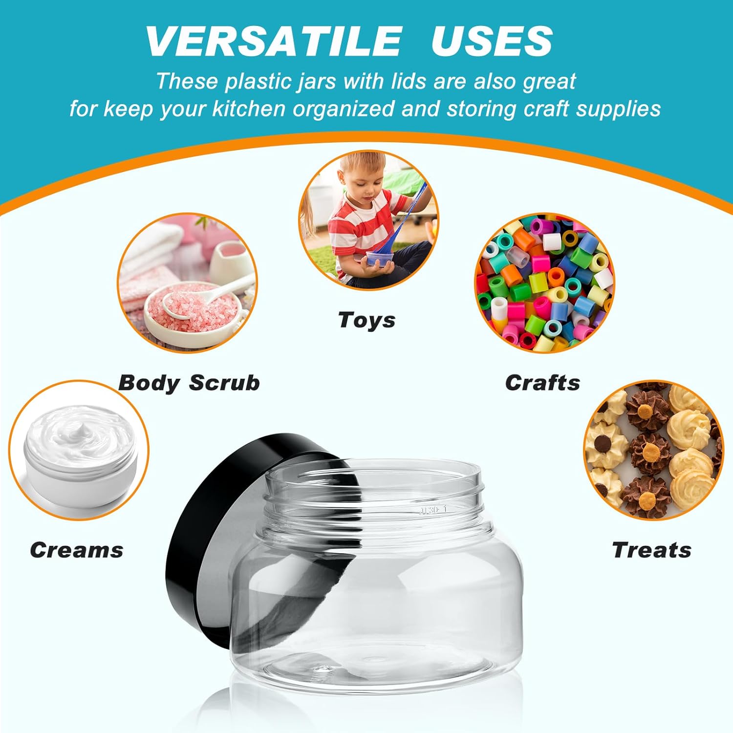 Tessco 24 Pack Plastic Jars with Lids Labels Empty Clear Plastic Jars Round Refillable Cosmetic Containers Body Butter Containers Bulk Sugar Scrub Bottle for Make Up(8 oz,Multicolor)