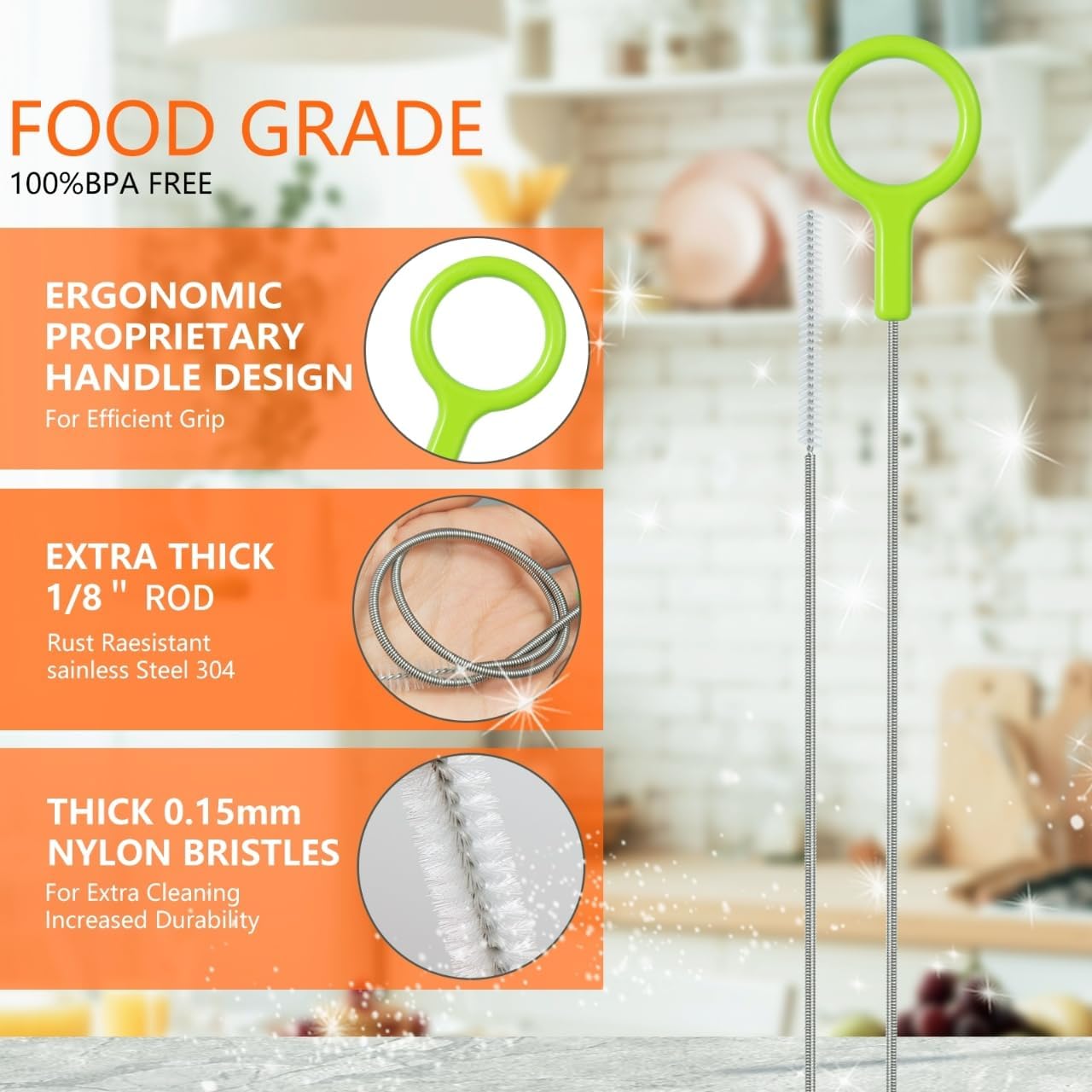 - ✅🫙HIGHT QUALITY: These Long Straw Brushes Made of top 18-8 food grade 304 stainless steel wire. With the long ,soft but Durable nylon bristles which it doesn’t leave a lot of fuzz behind in the pipe like Chenille pipe cleaners do which you need to take the trouble to get rid of it. End tip coating that can protective glass straws or soft tubes that does not scratch the inside, BPA free. You can feel free to buy bottle brush with full confidence.