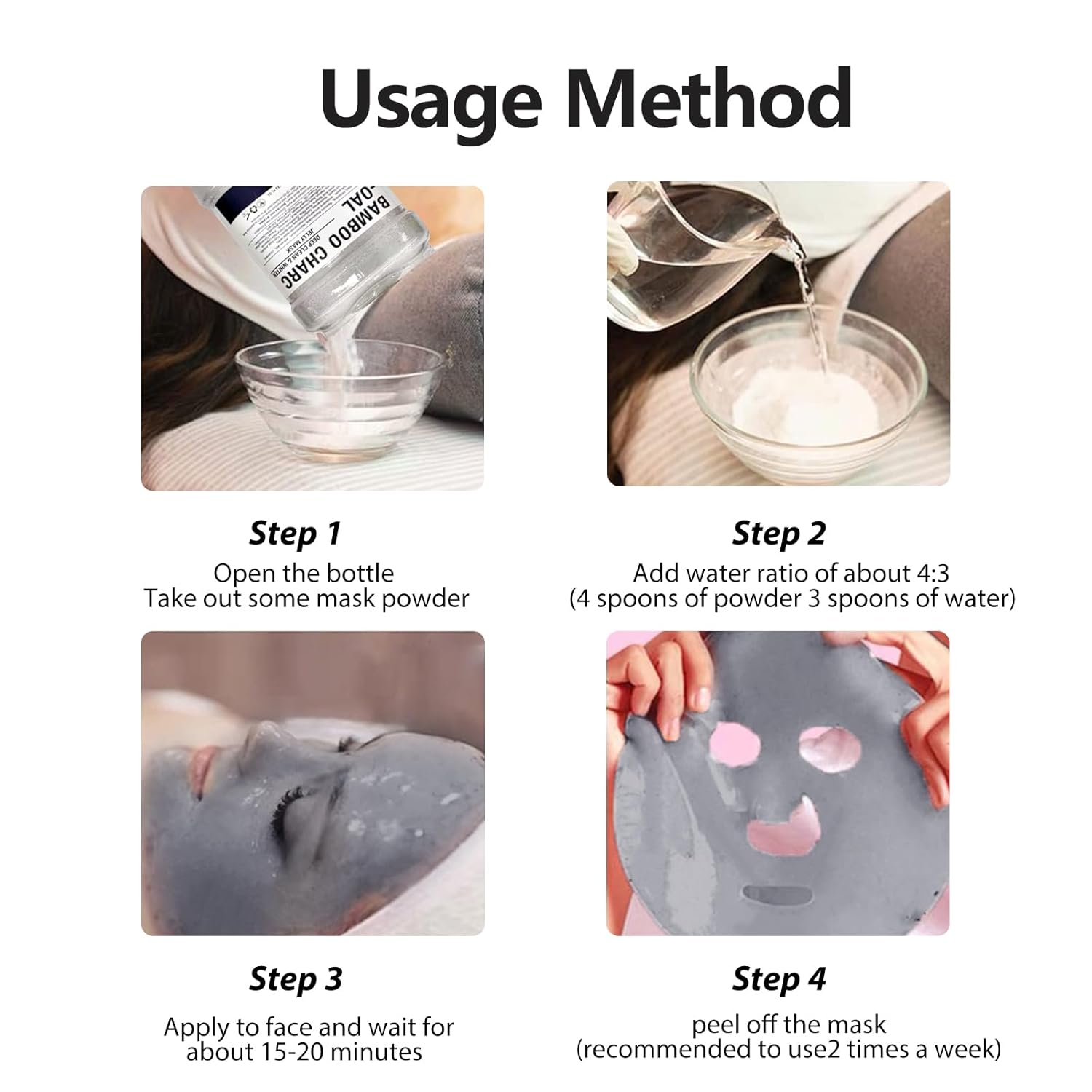 - Mixing ratio: Mask powder and water are mixed in a ratio of 4:3. If you feel that it is too thin and it will slide down your face, you can add more powder. If you feel that it is too dry to fully absorb, you can add some water. If you With some patience, you will save yourself the cost of going to the beauty salon