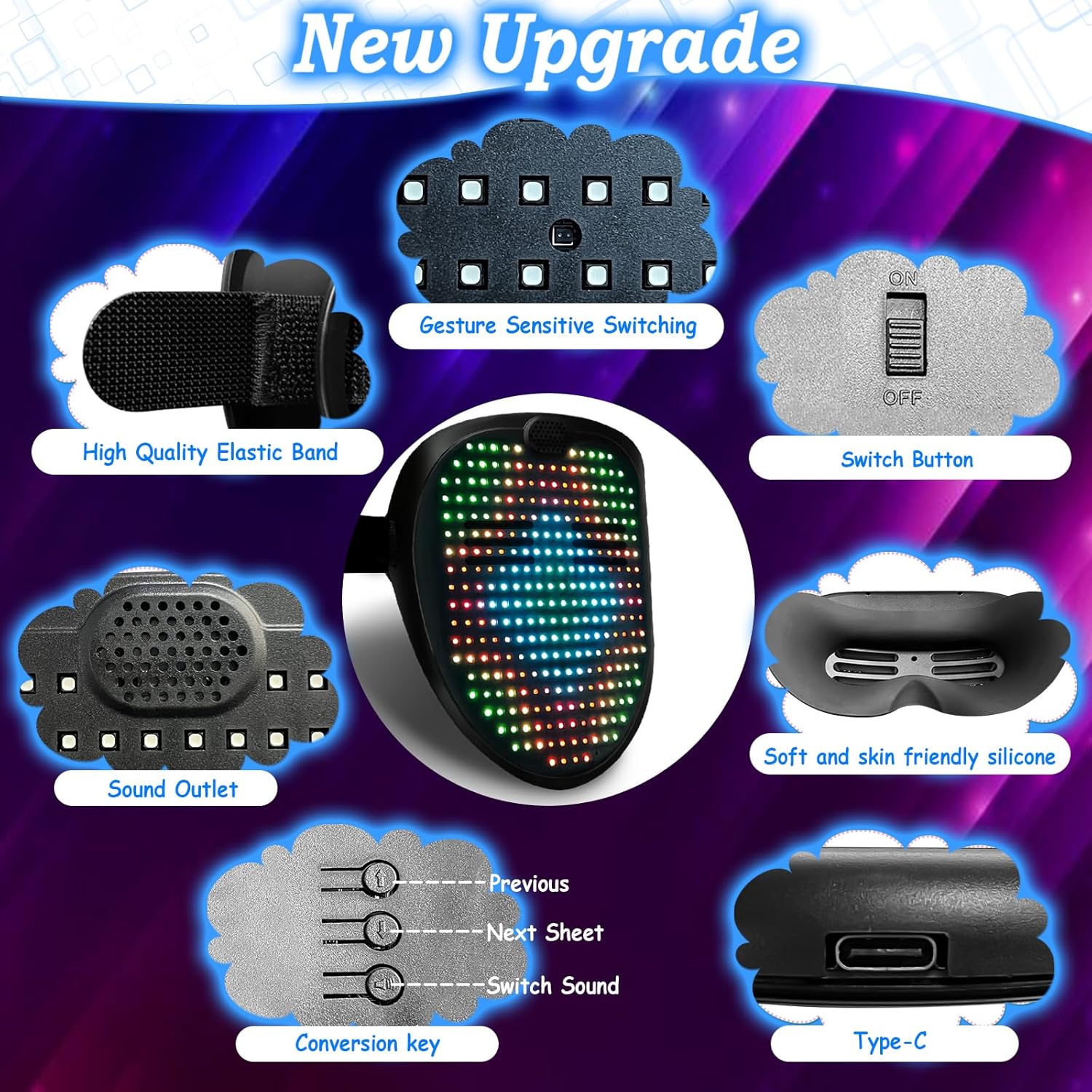 - [Comfortable to Wear and High-Quality]: Made of tough plastic and Soft sponge, You can wear this led mask for a long time. Its ergonomic design, soft interior, and pre-cut eyeholes ensure a comfy fit all day. It is lightweight and comfortable to wear without any burden. The sound switch allows you to turn sound on or off.