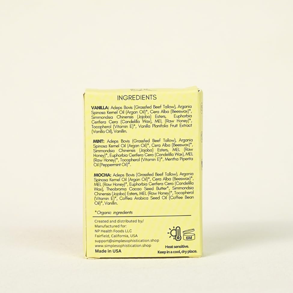 - 100% Natural, Organic, Ecofriendly: Our lip balm is made with only the finest, most natural ingredients. We use 100% grassfed beef tallow, organic raw honey, and argan oil to create a luxurious and nourishing lip balm that is free from harmful chemicals, paraffin, and synthetic fragrances.