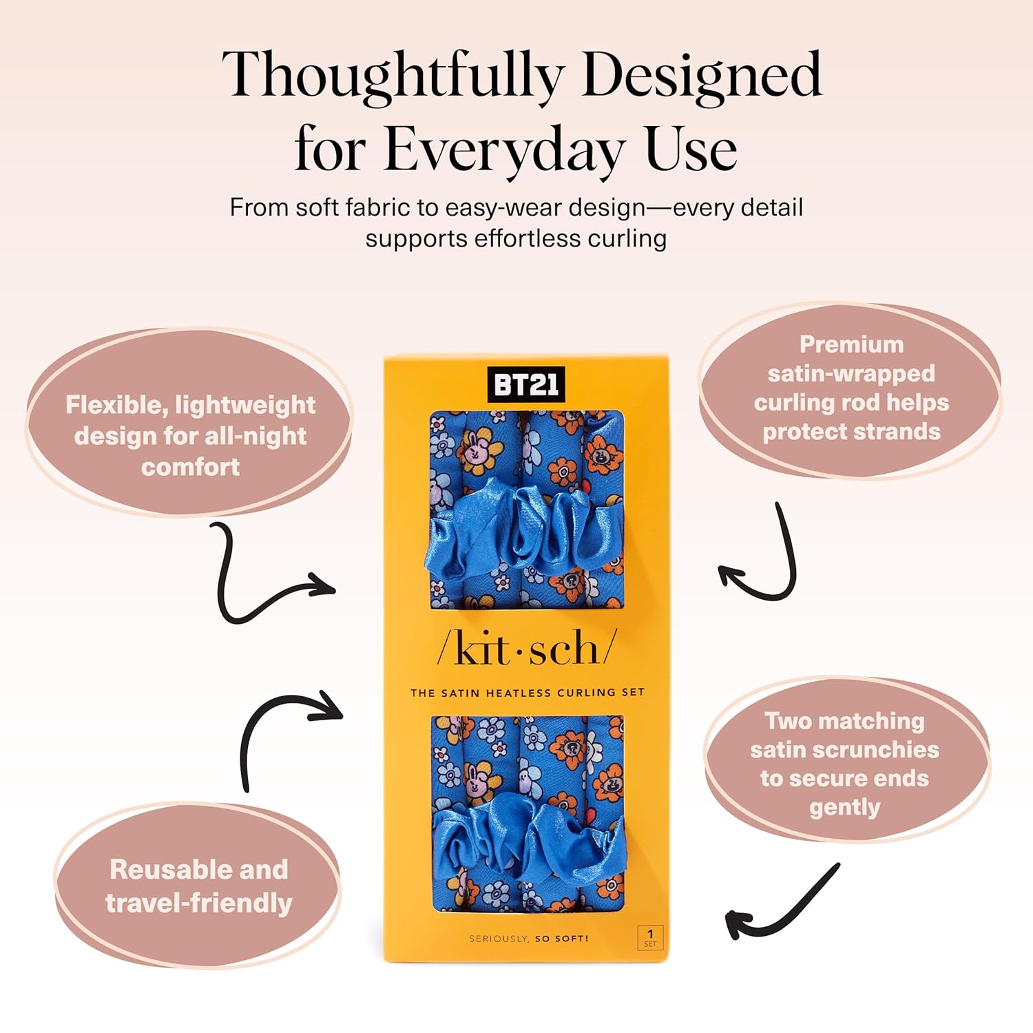 BT21 x Kitsch Satin Heatless Hair Curler Set - Heatless Curls Overnight, Hair Rollers for Soft Curls & Frizz-Free Styling, No Heat Curlers To Sleep in, Curling Rod Headband for Overnight Curl - BT21