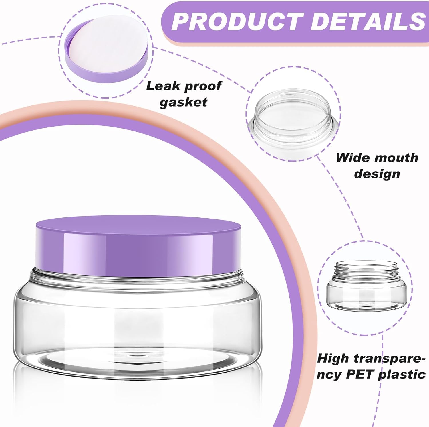 Tessco 24 Pack Plastic Jars with Lids Labels Empty Clear Plastic Jars Round Refillable Cosmetic Containers Body Butter Containers Bulk Sugar Scrub Bottle for Make Up(5 oz,Clear, Purple)