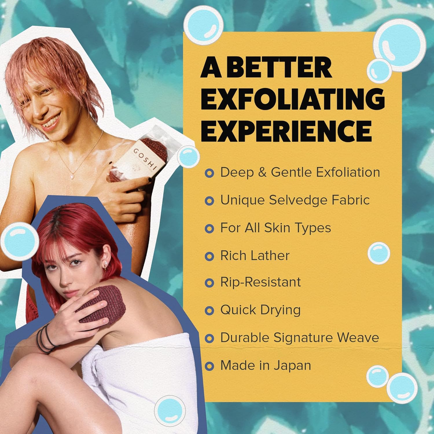 - The Softest and Cleanest You’ll Ever Feel: Introducing an exfoliating shower sponge for a refreshing body exfoliation experience made easy. Crafted in the finest Japanese textile mills, the GOSHI exfoliating shower sponge is woven with subtly contrasting fibers that both scrub your skin clear and wash your body clean.