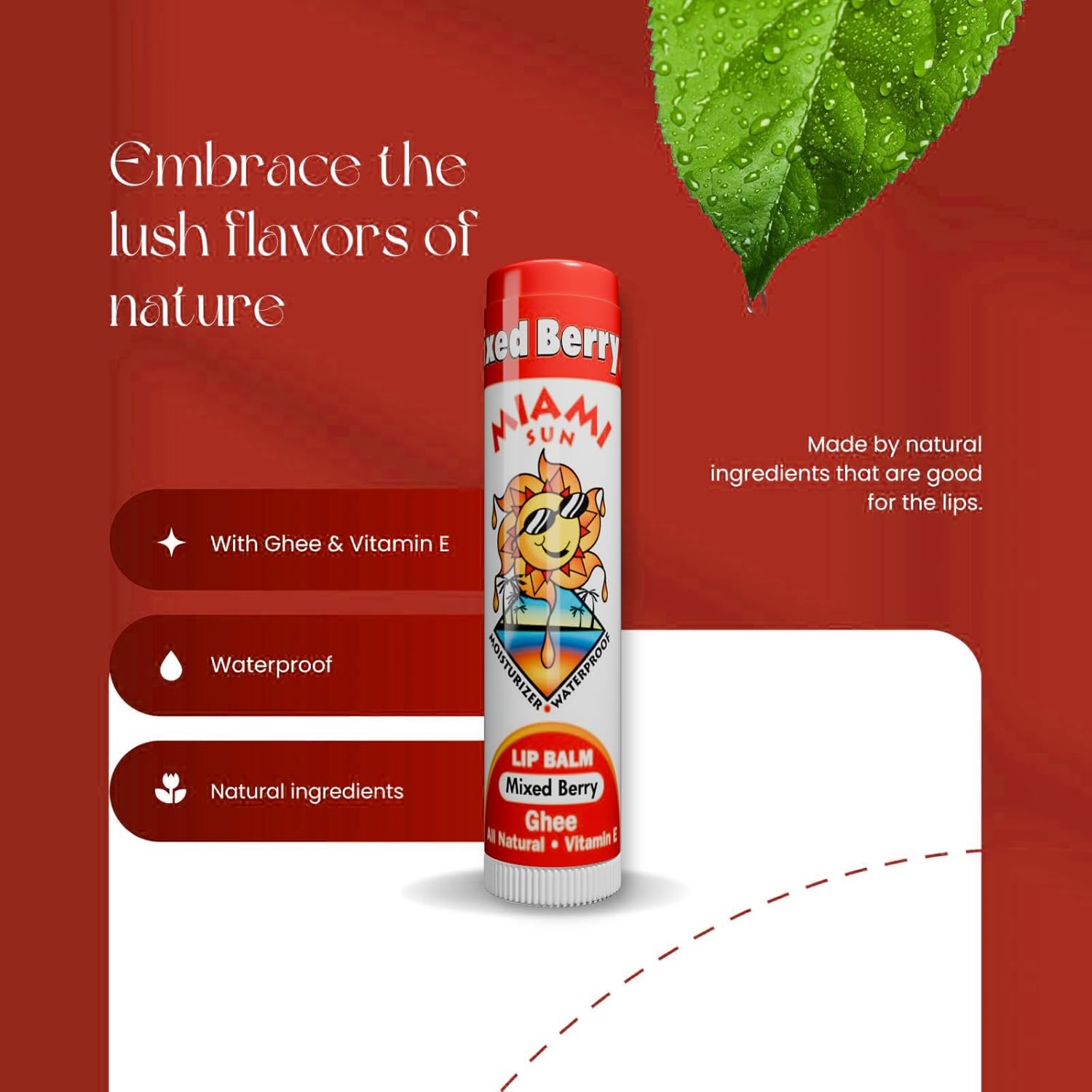 Miami Sun Natural Ghee Lip Balm, Hydrating Lip Treatment with Shea Butter & Beeswax, Organic & Non-Toxic, Best for Dry, Chapped Lips - Moisturizing, Healing, Chemical-Free Care (4 Count, Mixed Berry)