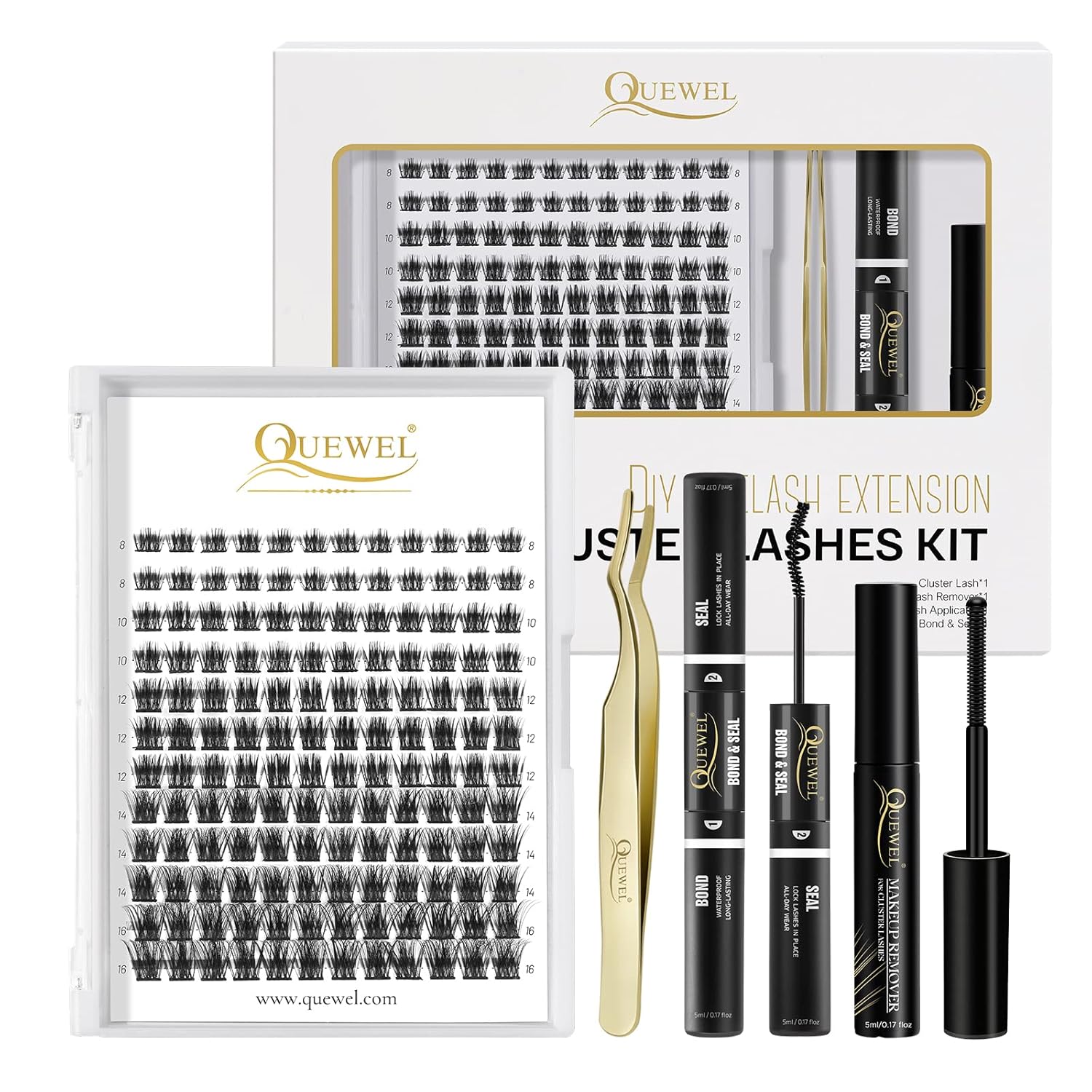 - A Perfect Set-DIY Lash Extensions Kit: QUEWEL DIY eyelash extensions kits, 144pcs wide stem lash clusters, black lash bond&seal, a golden tweezer for applying lash clusters and 5ml cluster eyelashes glue remover, you can get all the products you need for DIY eyelash extensions at an affordable price, so convenient to use at home or travel, without taking up too much storage space