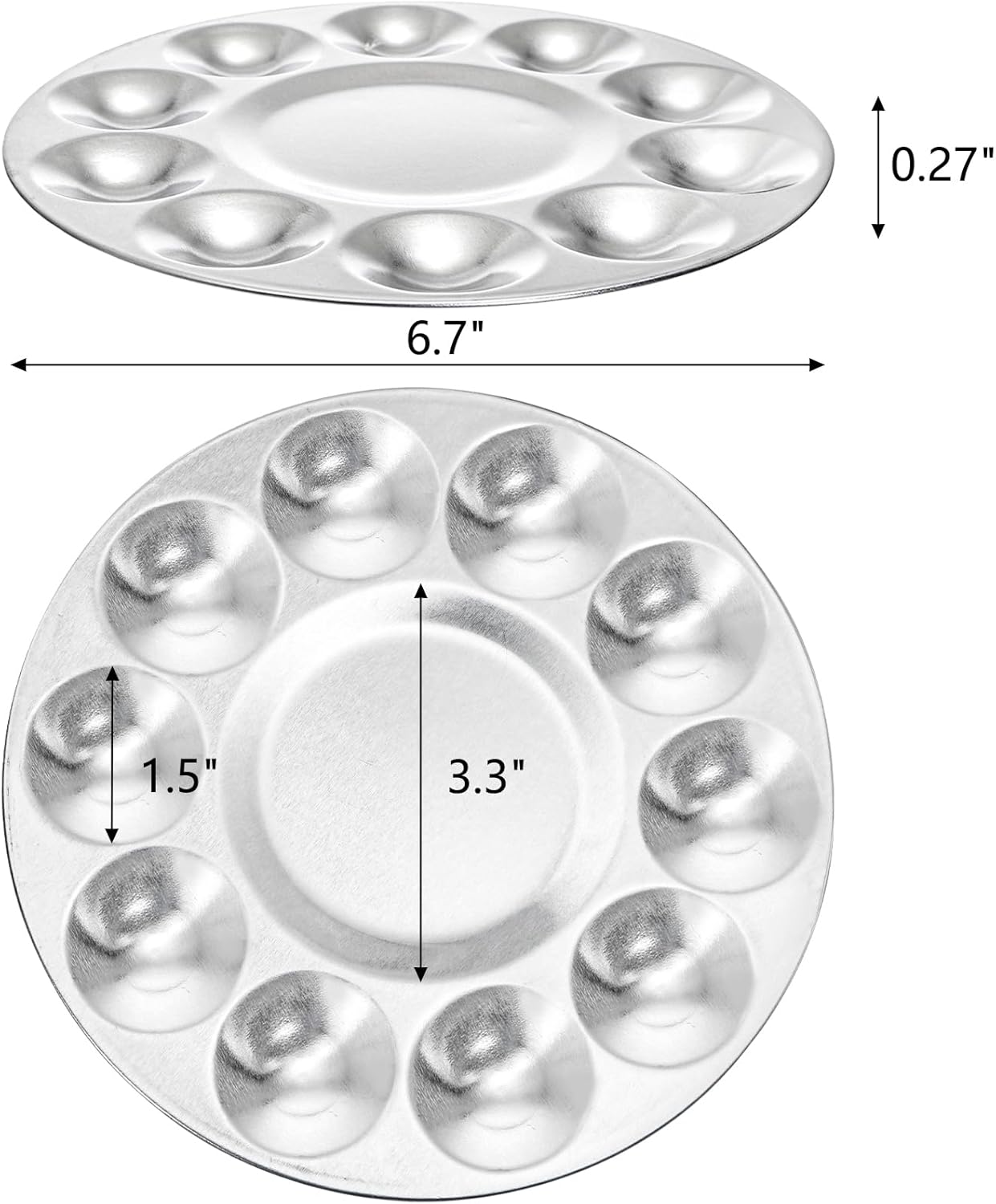 - Package Details: You will receive 10 Pcs paint tray palettes, measuring 6.7" D x 0.27" H. Every metal paint palette features 10 wells, each with a diameter of 1.5", while the central reservoir measures 3.3"