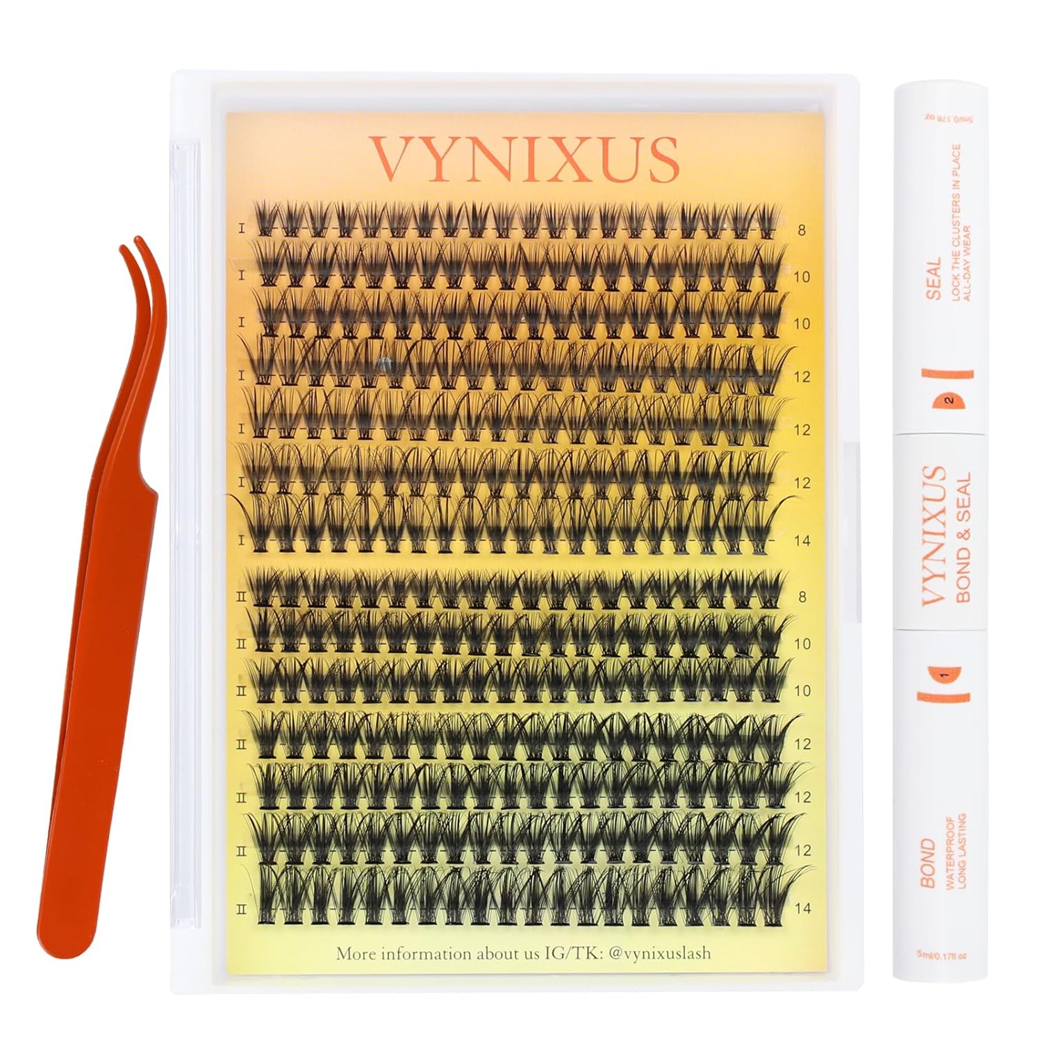 - ALL-IN-1 Lash Clusters Kit: VYNIXUS DIY lash extension kit includes 280pcs Lash Clusters, Lash Bond and Seal, Eyelash Remover, LashTweezers and Brush. Everything you need is right here. Create salon quality shiny lashes effortlessly anytime while saving time and money