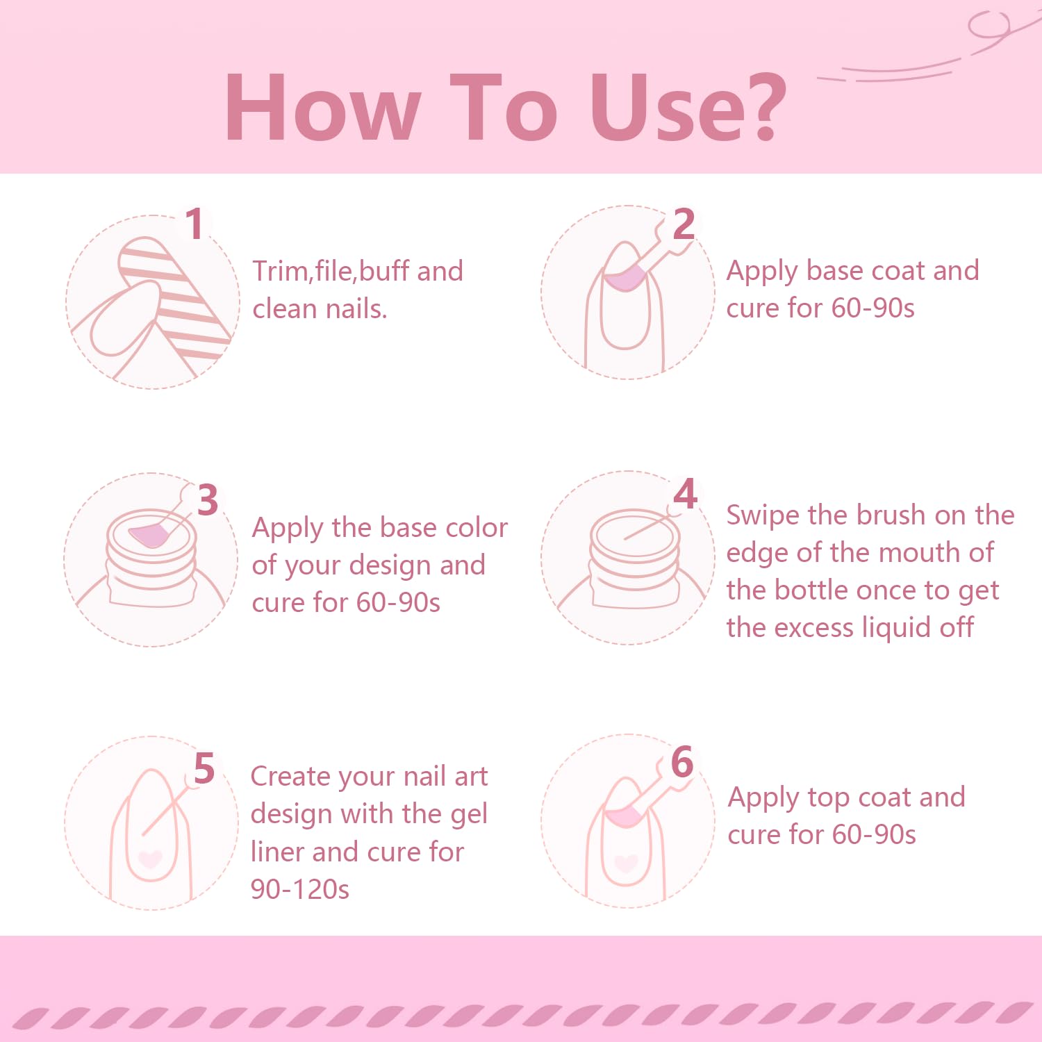 - Nail Lamp Curing: Nail Art Gel Base Coat Set Brush is simple, easy and fast to operate , LED nail lamps have an average curing time of 60-120 seconds and require a base coat and top coat.