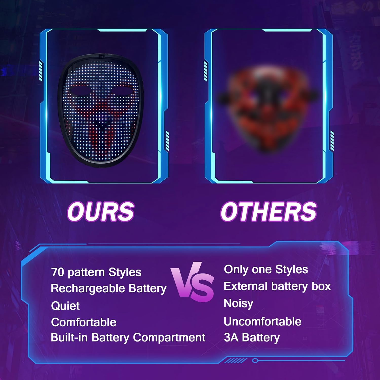 - Long-lasting Power: USB Type-C charging (5V/1A); first charge takes 3-4 hours, and the battery life lasts up to 10 hours, making the LED face-changing mask perfect for long-term use at festivals, schools or outdoor activities.