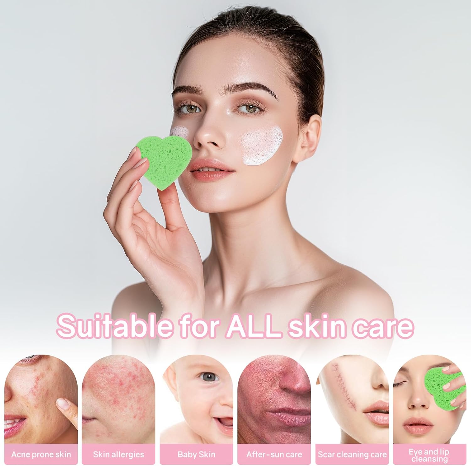 - 【Packing Quantity】--50-Count heart face sponges for cleansing.