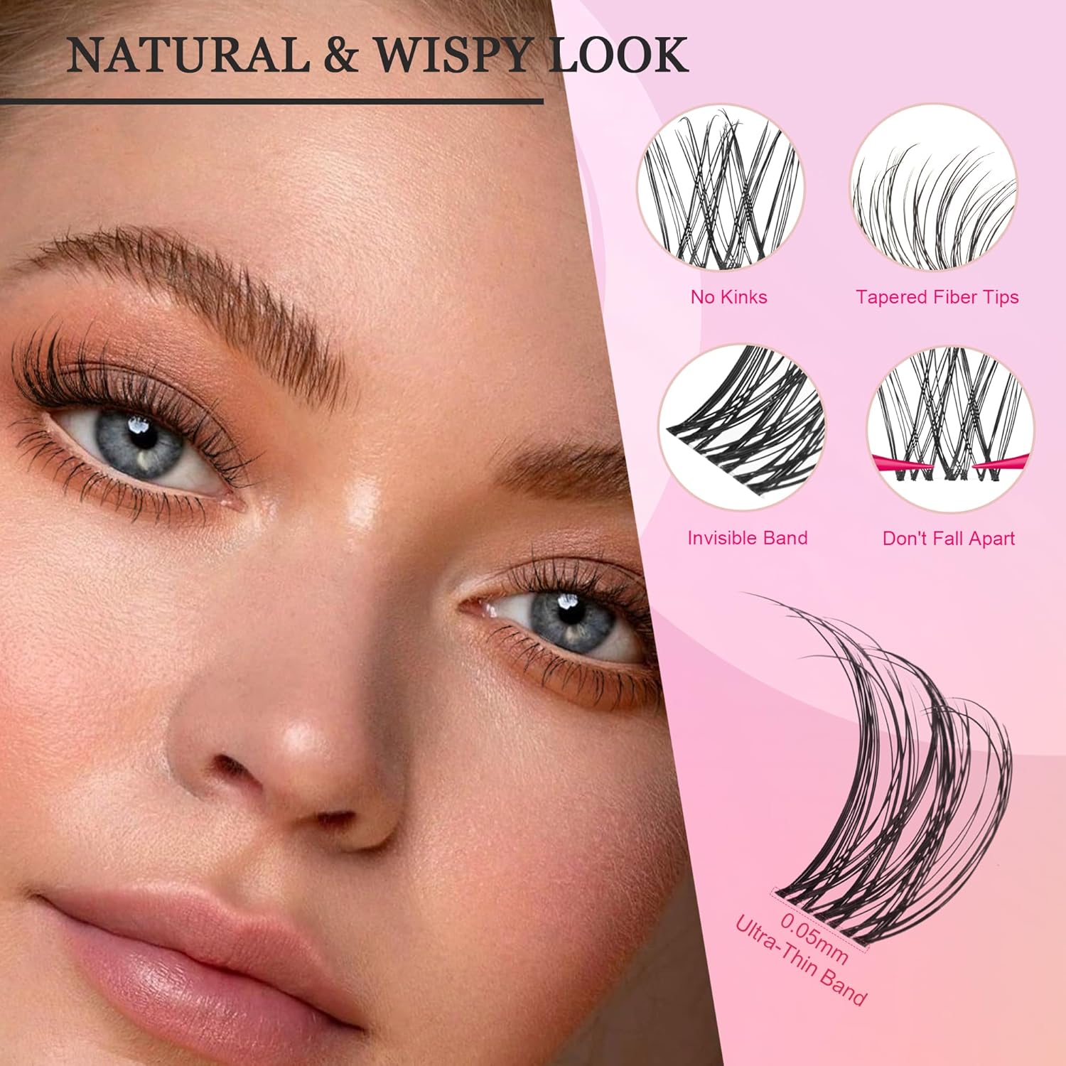 - 【0.05mm Ultra-Invisible Eyelash Band】Crafted with 30 refined processes and meticulously hand-cut for the perfect length in every cluster, it easily molds to the eye shape for a natural look. The ultra-thin 0.05mm super-thin fishing line lash band is flexible and molds perfectly to your eyelid, providing a seamless, natural fit.Elastic fibers allow for easy reshaping. Reusable and resilient, these lashes bounce back to their original form after every use, ensuring long-lasting wear. Simply clean off the adhesive from the lash strip, and they’re ready to reuse again and again.