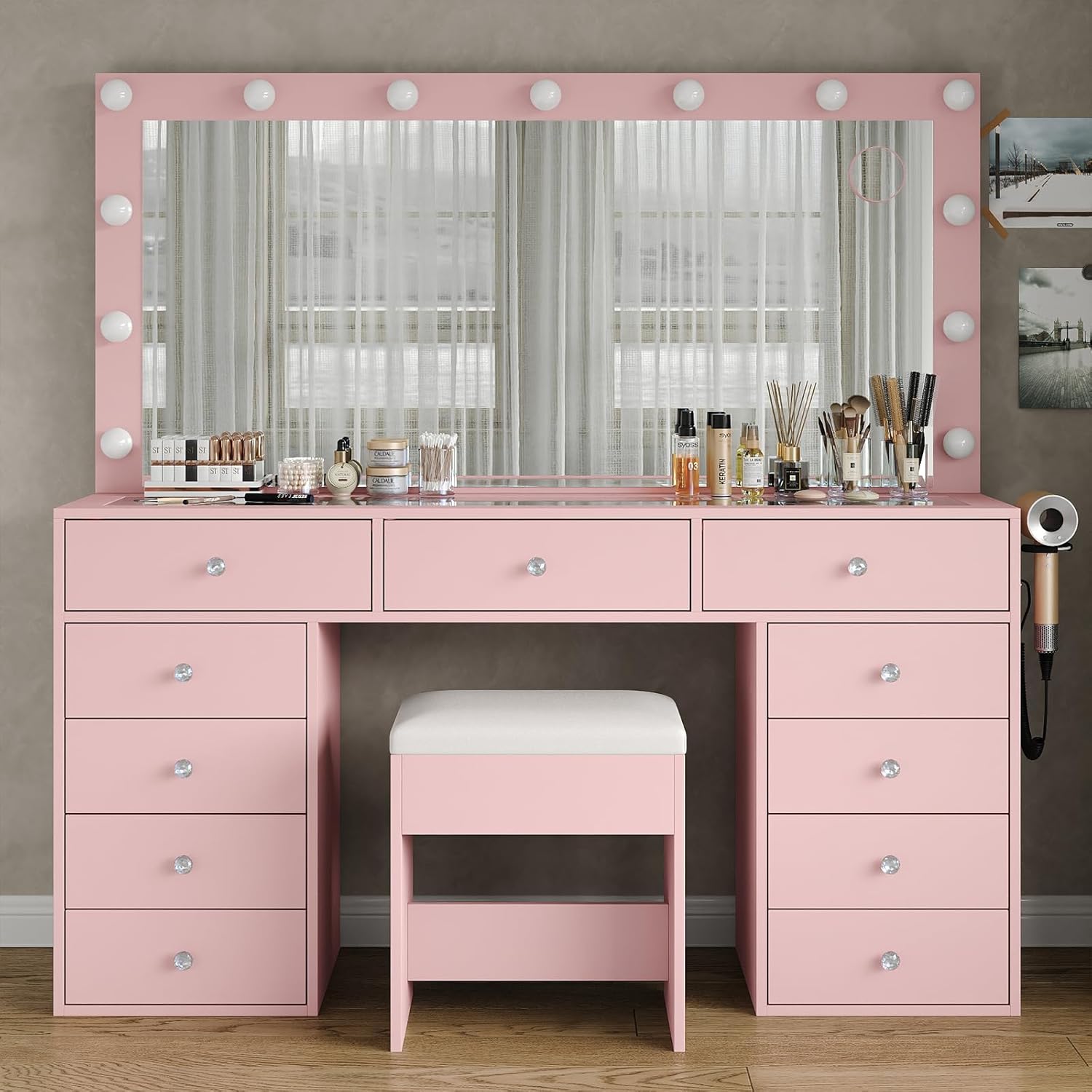 11 Drawers Makeup Vanity with Charging Station, Vanity Desk with 13 LED Bulbs and HD Mirror, 3 Color Brightness Adjustable, Glass Top Vanity Set for Bedroom, Pink