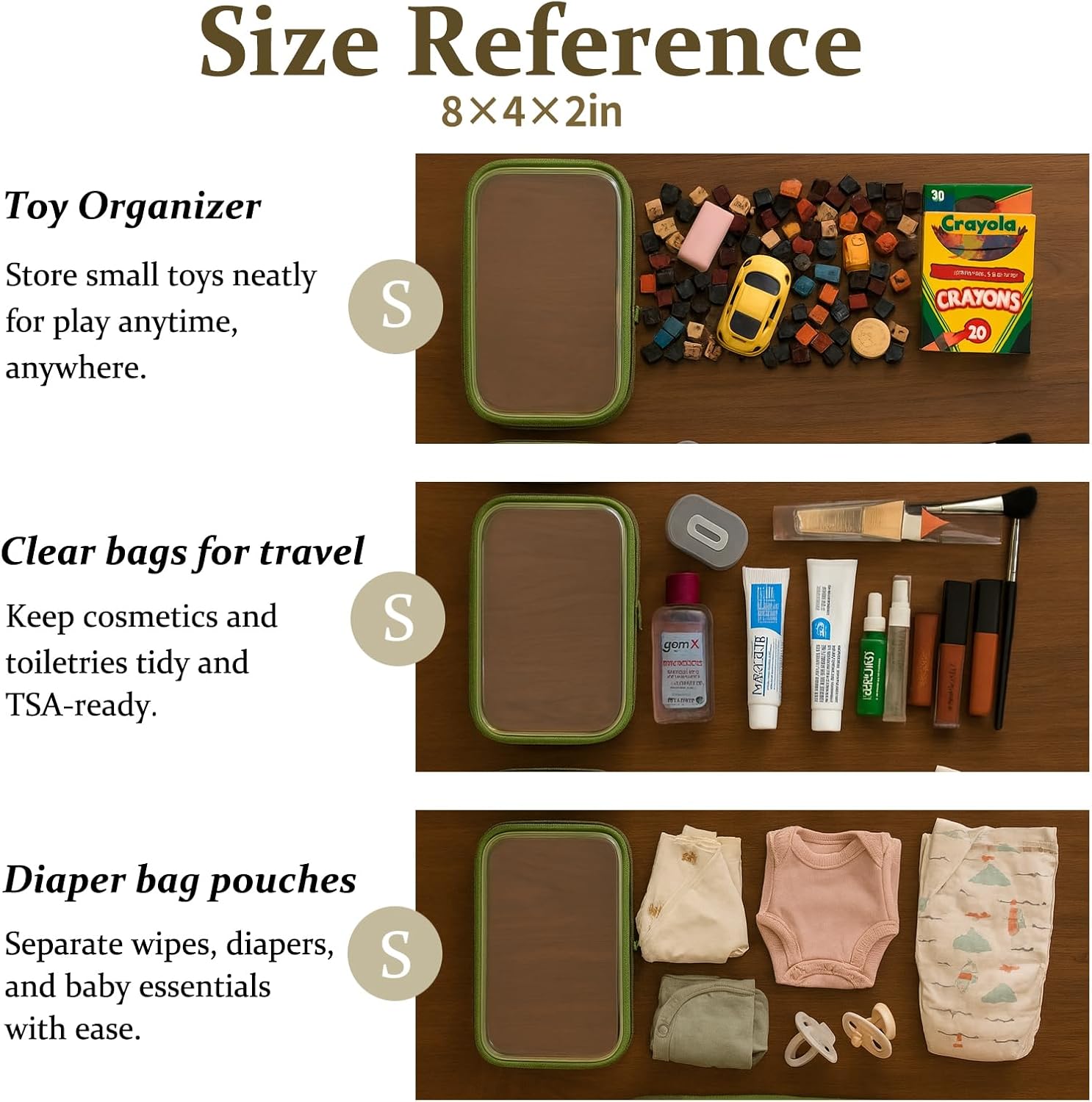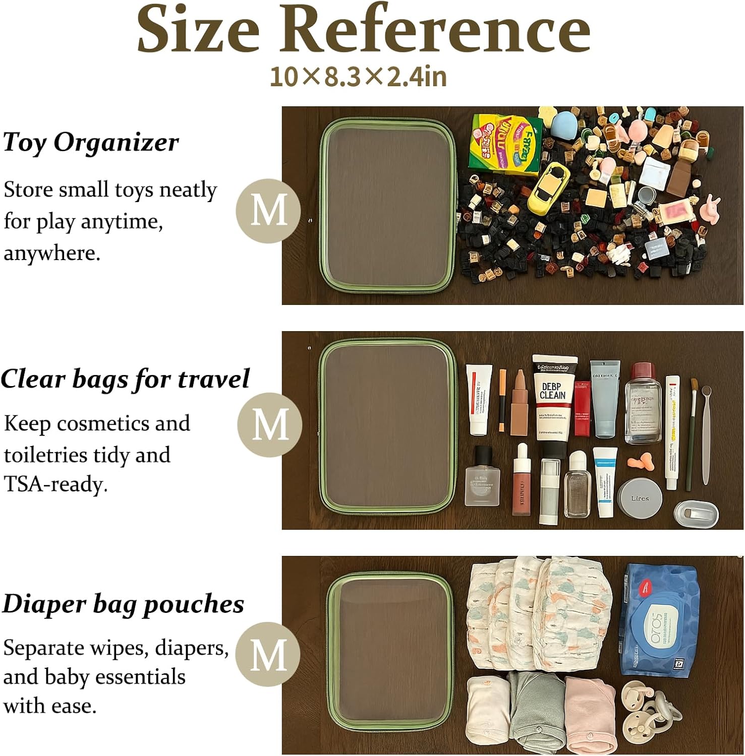 - Multi-Use Storage for Daily Essentials. Perfect as a bag organizer for makeup, toiletries, charging cables, pens, or travel-size items. Whether at home or packing a diaper bag, these clear zipper pouches help sort small items with ease.