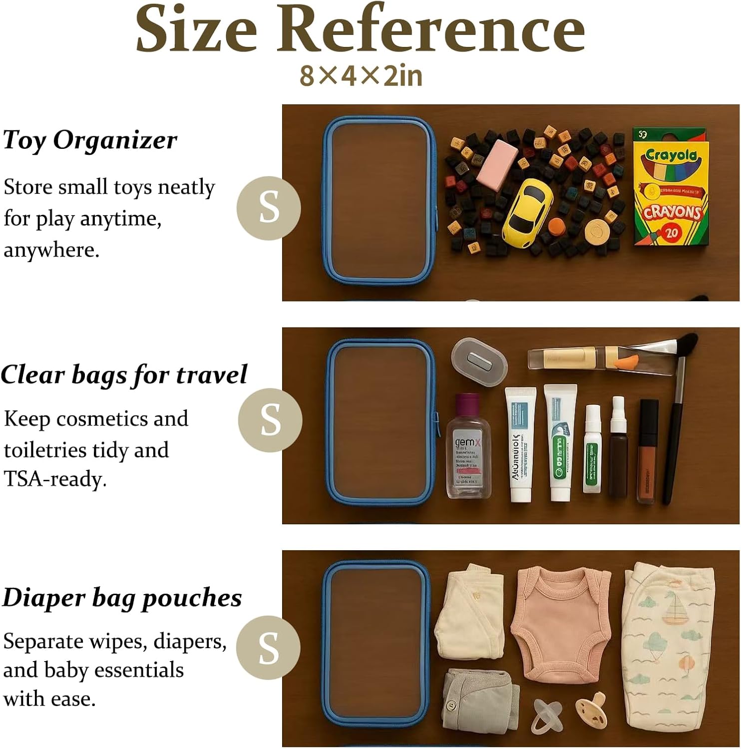 - Multi-Use Storage for Daily Essentials. Perfect as a bag organizer for makeup, toiletries, charging cables, pens, or travel-size items. Whether at home or packing a diaper bag, these clear zipper pouches help sort small items with ease.