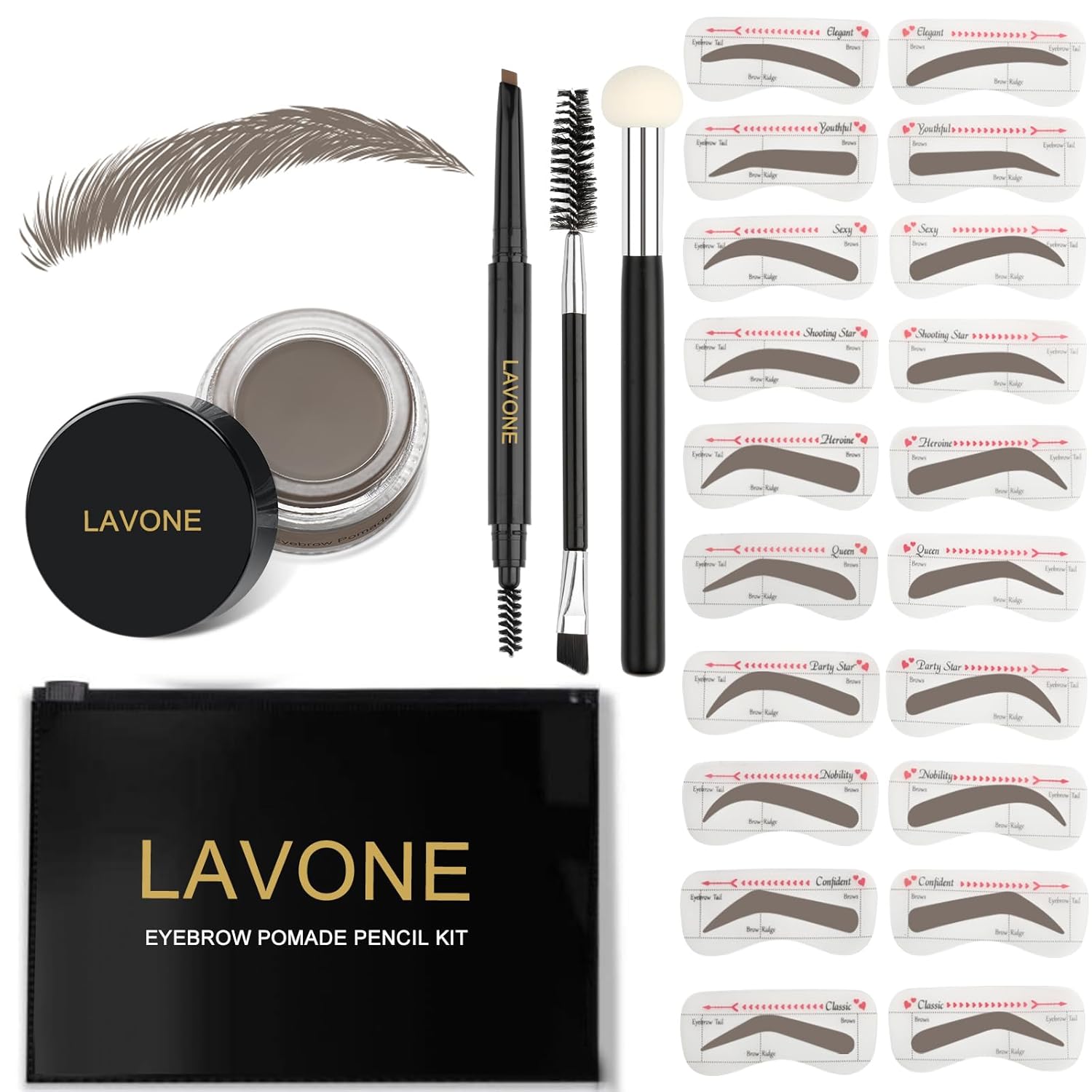 - [What’s in the eyebrow kit]: LAVONE makeup eyebrow kit includes brow pencil, eyebrow powder 20 eyebrow stencils (10 different shapes), a sponge applicator, a dual precision brush and a zipper pouch for on the go.