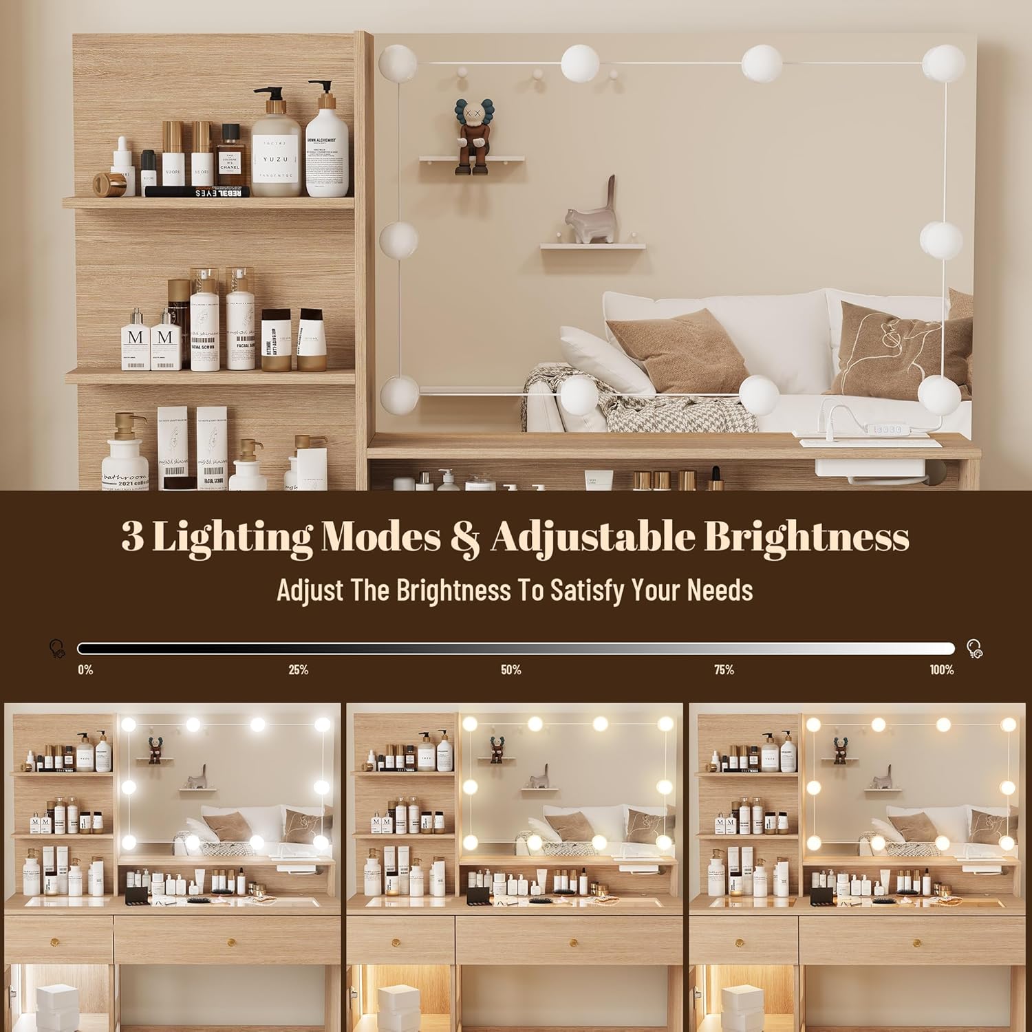 - 【Vanity Set with Large Mirror and LED Lights】This makeup vanity desk with lights features a large mirror with 10 Hollywood-style LED bulbs. Choose from 3 color modes (warm yellow, warm white, and cool white) and adjust the brightness settings to create the perfect lighting for your makeup needs. Ideal for home, work, hair salons, and studio makeup applications.